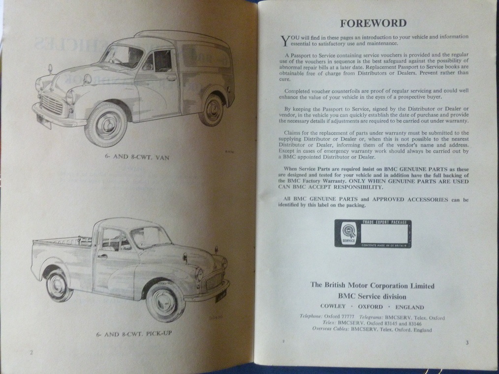 BMC FACTORY WORKSHOP MANUAL FOR THE MORRIS MINOR BASED VAN & PICK-UP. THE BOOK IS IN COMPLETE BUT USED CONDITION. DATED 1968. A RARE PUBLICATION NOW. OFFERED AT £18.00.
