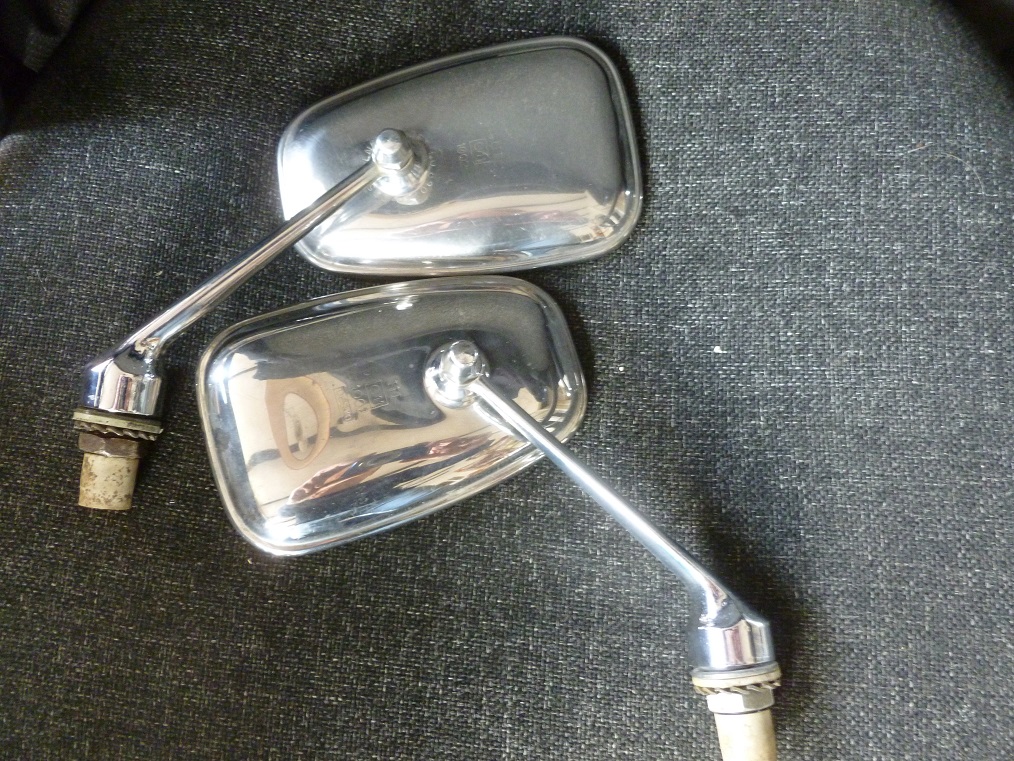 SPECIAL OFFER. ONE PAIR ONLY OF CURVED ARM DESMO MIRRORS. These have the longer (5.5 inch) arms and the larger heads too and are hard to obtain now. Special price of £80.00 for the pair. Pictured below.